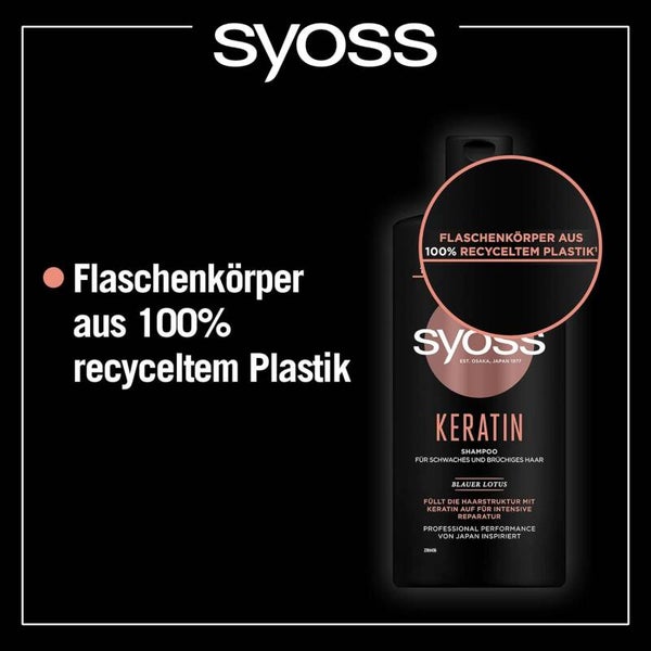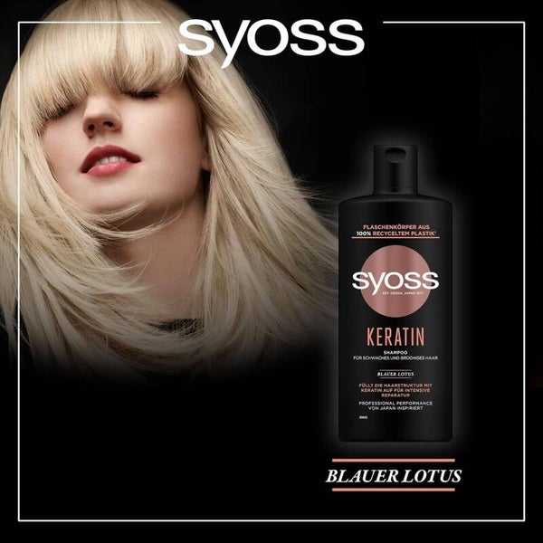 Das Syoss-Keratin-Shampoo füllt schwaches und brüchiges Haar mit Keratin auf. Es kombiniert den natürlichen, asiatisch inspirierten Inhaltsstoff Blauer Lotus mit einem Komplex aus essenziellen Aminosäuren, die die natürlichen Bausteine der Haare bilden. Beim Haarewaschen werden die Haare für eine Tiefenreparatur aufgefüllt und die Haarfaser wird geglättet. Die Formel enthält 90 % Inhaltsstoffe natürlichen Ursprungs, inklusive Wasser, und der Flaschenkörper des Shampoos besteht aus 100 % recyceltem Plastik (Kappe ausgenommen).